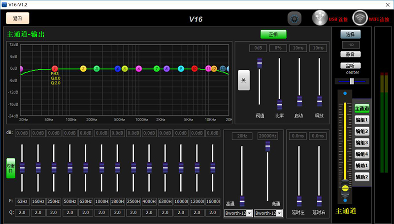 •每個輸入通道都內置高低通濾波,4段參數均衡,壓限器,延時,通道聲像平衡調節