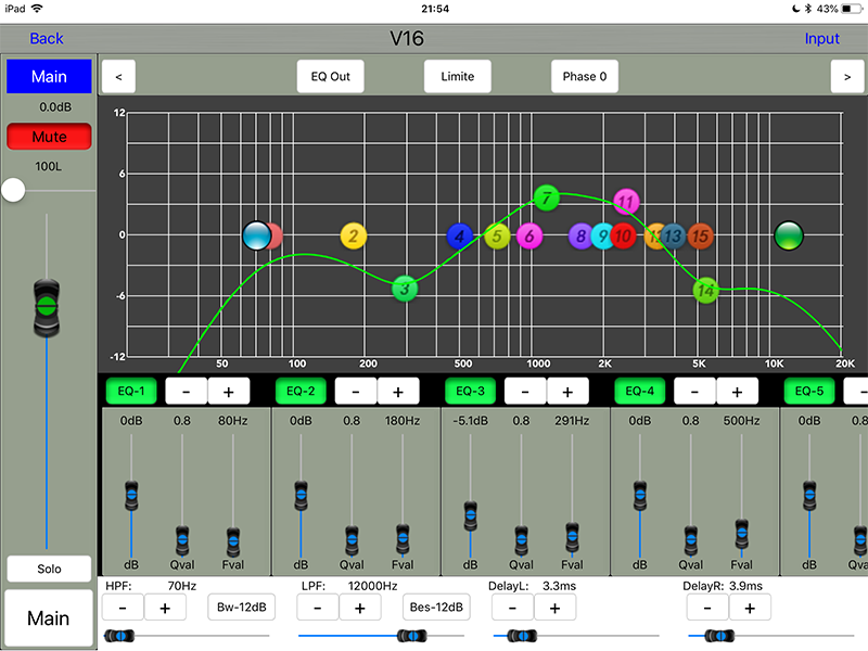 輸出15段全參量均衡:20-20kHz,+/-12db,